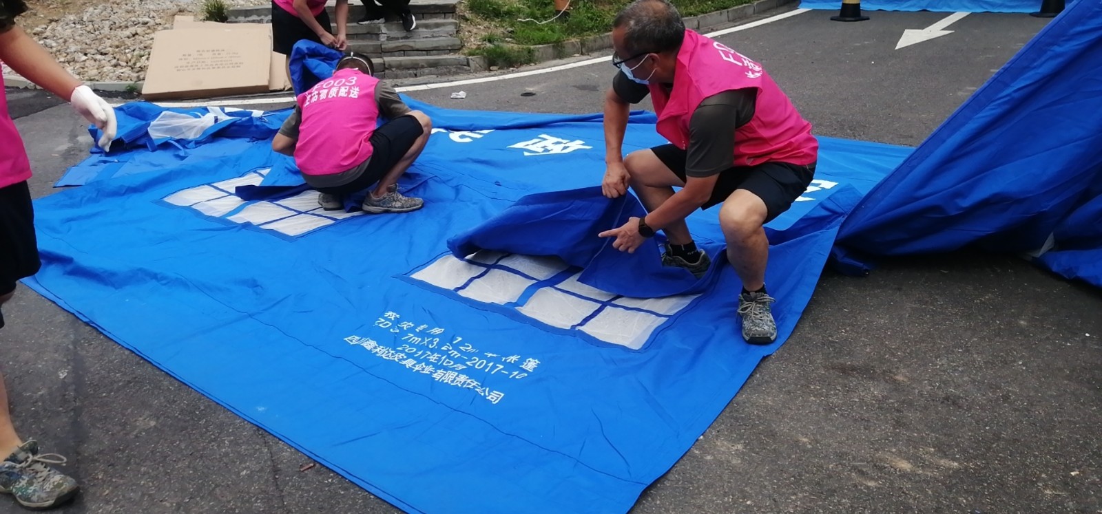 在當(dāng)?shù)匾咔榉揽刂笓]部的帶領(lǐng)下,王成勇、祝長青,身披“志愿紅”,深入封控區(qū)域,從晨光熹微到燈火闌珊,一整天都是后背全濕,每一天都是腰酸背痛。但他們明白,“哪里需要就沖向哪里”。二人先后9次進(jìn)入高風(fēng)險區(qū)搭建應(yīng)急帳篷,為的是這一頂頂帳篷能夠為來自四面八方、各行各業(yè)的志愿者們遮風(fēng)擋雨,每天一趟趟一袋袋的蔬菜、肉、米、油,讓當(dāng)?shù)鼐用衽c游客每天都能夠安心避疫。