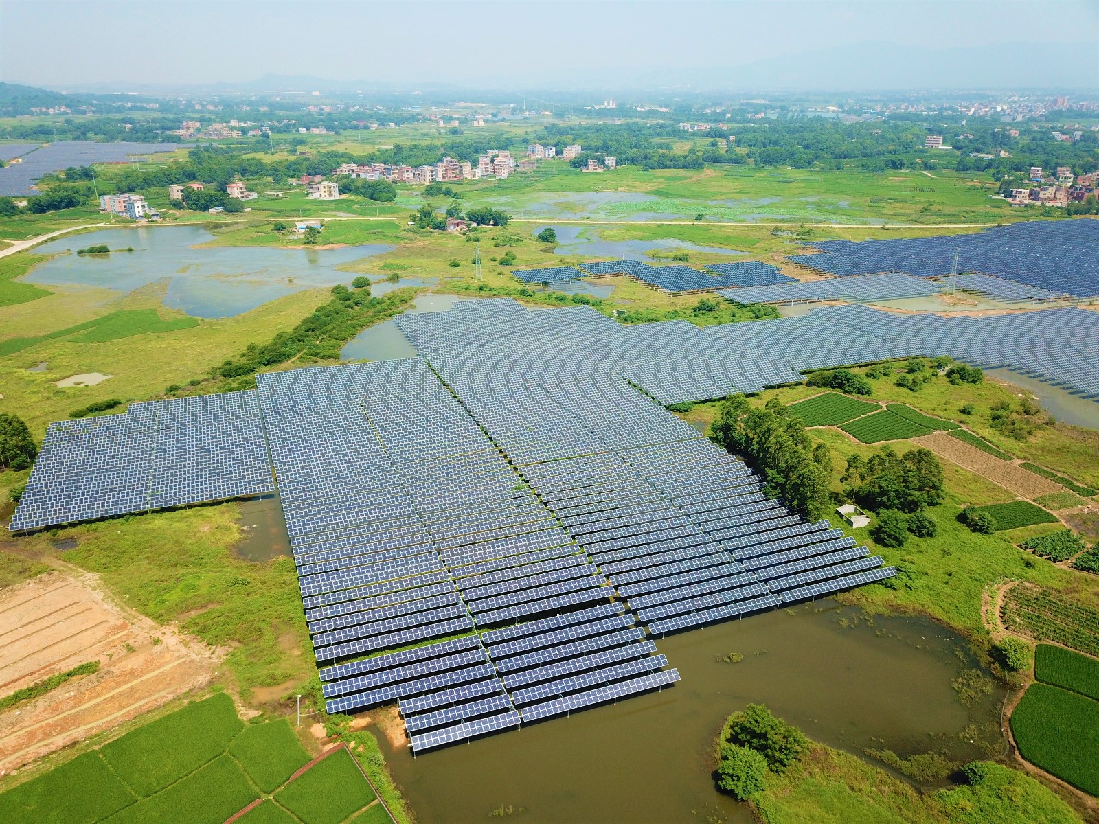 在廣西壯族自治區(qū)桂平市中部偏西,坡地上一大片高高架起的光伏藍板排列有序、十分顯眼,空中俯瞰猶如一汪藍色海洋,蔚為壯觀,與四周環(huán)繞的綠色田野構(gòu)成了一幅壯美和諧的生態(tài)畫卷。