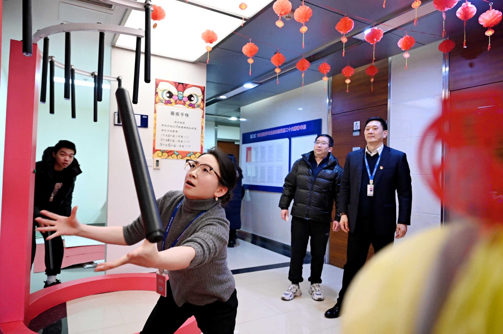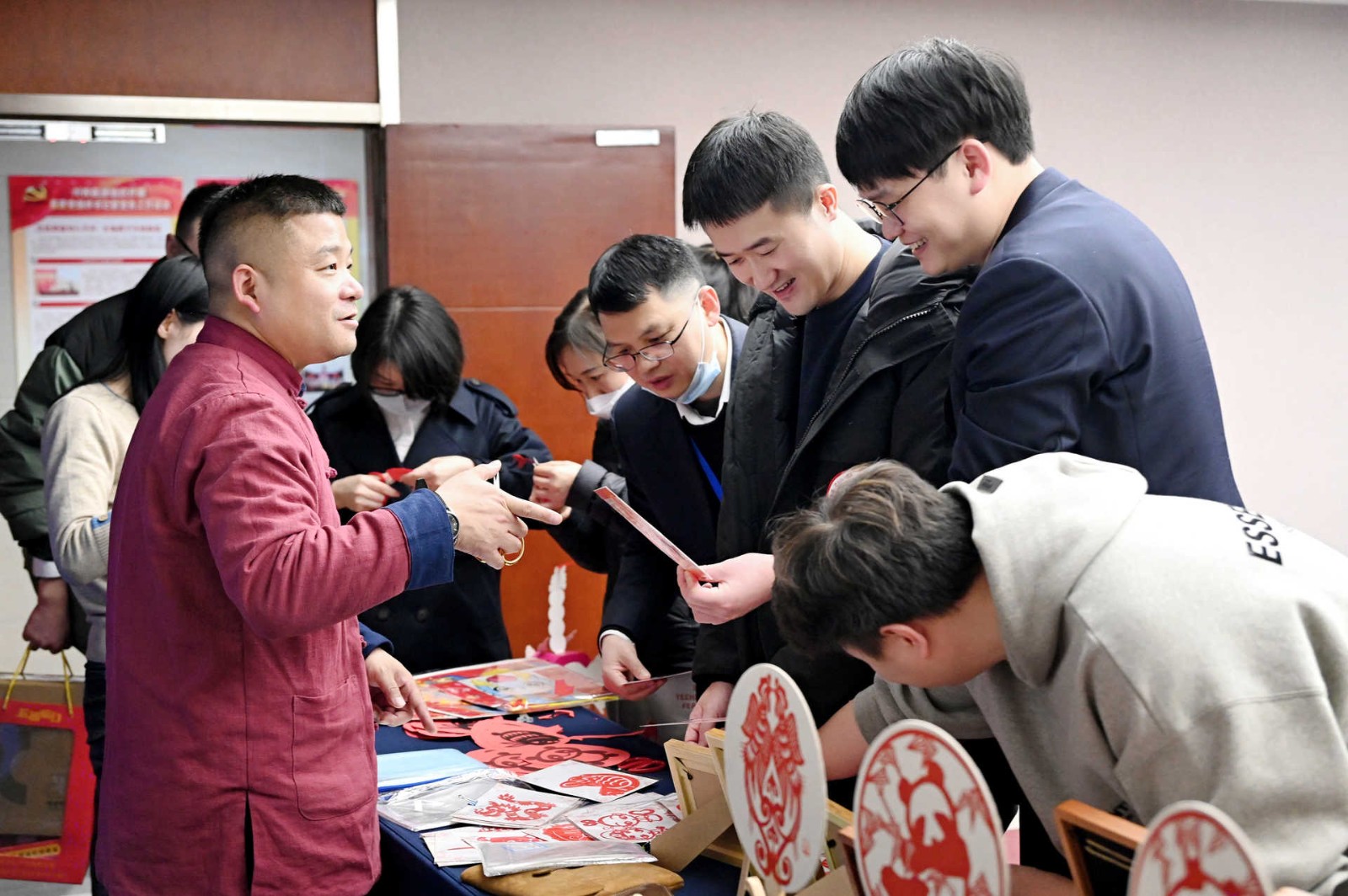 此次活動(dòng)采用游園方式,現(xiàn)場(chǎng)設(shè)置了民俗體驗(yàn)區(qū)、非遺手作區(qū)、民俗體驗(yàn)區(qū)、新春互動(dòng)區(qū)、游戲互動(dòng)區(qū)等5個(gè)活動(dòng)區(qū)域,涵蓋猜燈謎、剪窗花、做龍燈、滾滾樂(lè)等8個(gè)活動(dòng)?;顒?dòng)現(xiàn)場(chǎng)每一處都用心裝扮,火紅的中國(guó)燈籠、精美的傳統(tǒng)對(duì)聯(lián)伴隨濃郁的新年味道彌散在會(huì)場(chǎng)的每一個(gè)角落。大家爭(zhēng)先恐后、玩勁十足,盡享新春的熱鬧與喜悅!有的圍著掛著紅線(xiàn)繩的燈謎卡片,仔細(xì)閱讀謎語(yǔ),認(rèn)真思考,沉浸在猜謎的樂(lè)趣中;有的圍在四川剪紙非遺傳承人莊叢燦老師周?chē)贿咇雎?tīng)著剪紙的技巧,一邊仔細(xì)修理邊角,用心精雕細(xì)琢;有的在學(xué)習(xí)制作龍燈,他們展現(xiàn)出極高的熱情和創(chuàng)造力,根據(jù)自己的想象,給龍燈增添了各種裝飾,如彩紙、亮片等,使得每個(gè)龍燈都獨(dú)具特色。