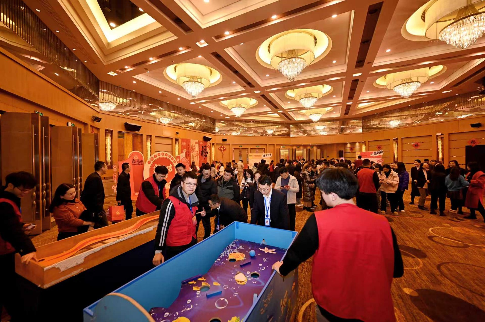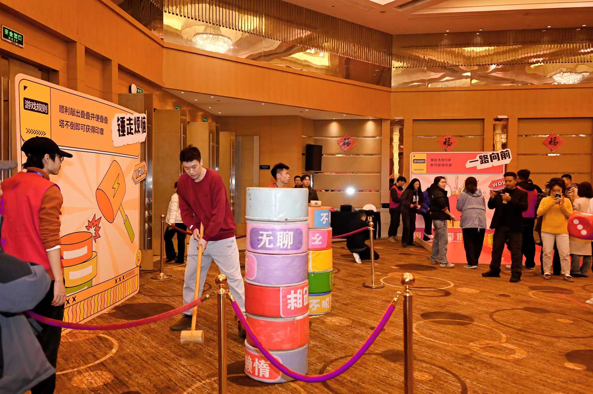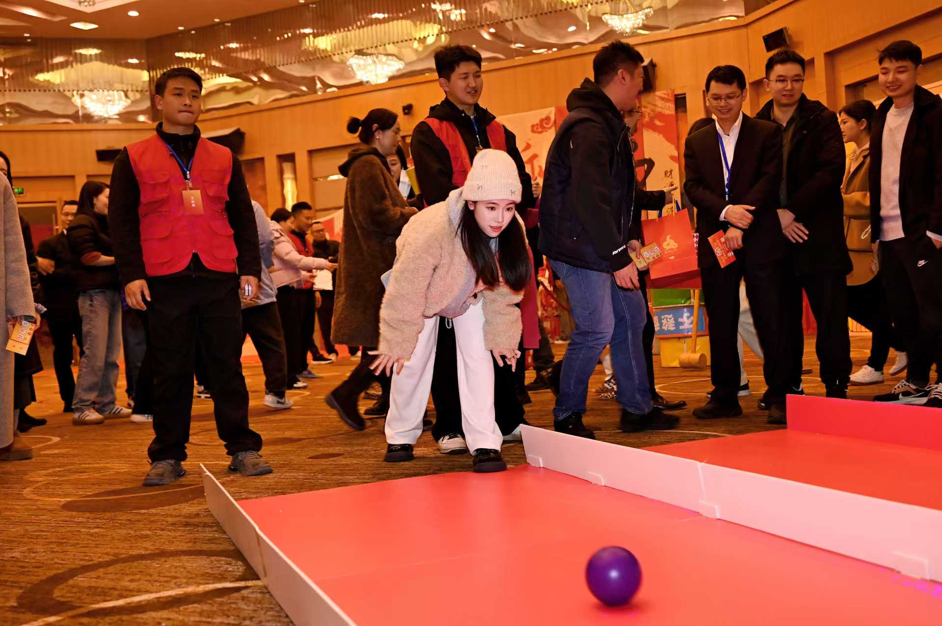一路向前區(qū),職工們輪流上陣,用力擲出保齡球,體驗運動的樂趣與激情;錘走煩惱區(qū),職工們通過敲擊“煩惱圈”,釋放壓力,享受智慧與技巧的碰撞 ;蛇舞新春區(qū),參賽者屏息凝神,用盡全力推動小球,看它在賽道上蜿蜒;拼出未來區(qū),只見每位職工選手抱著不同顏色和形狀的“方塊”,構(gòu)建圖案并迅速完成拼裝。
