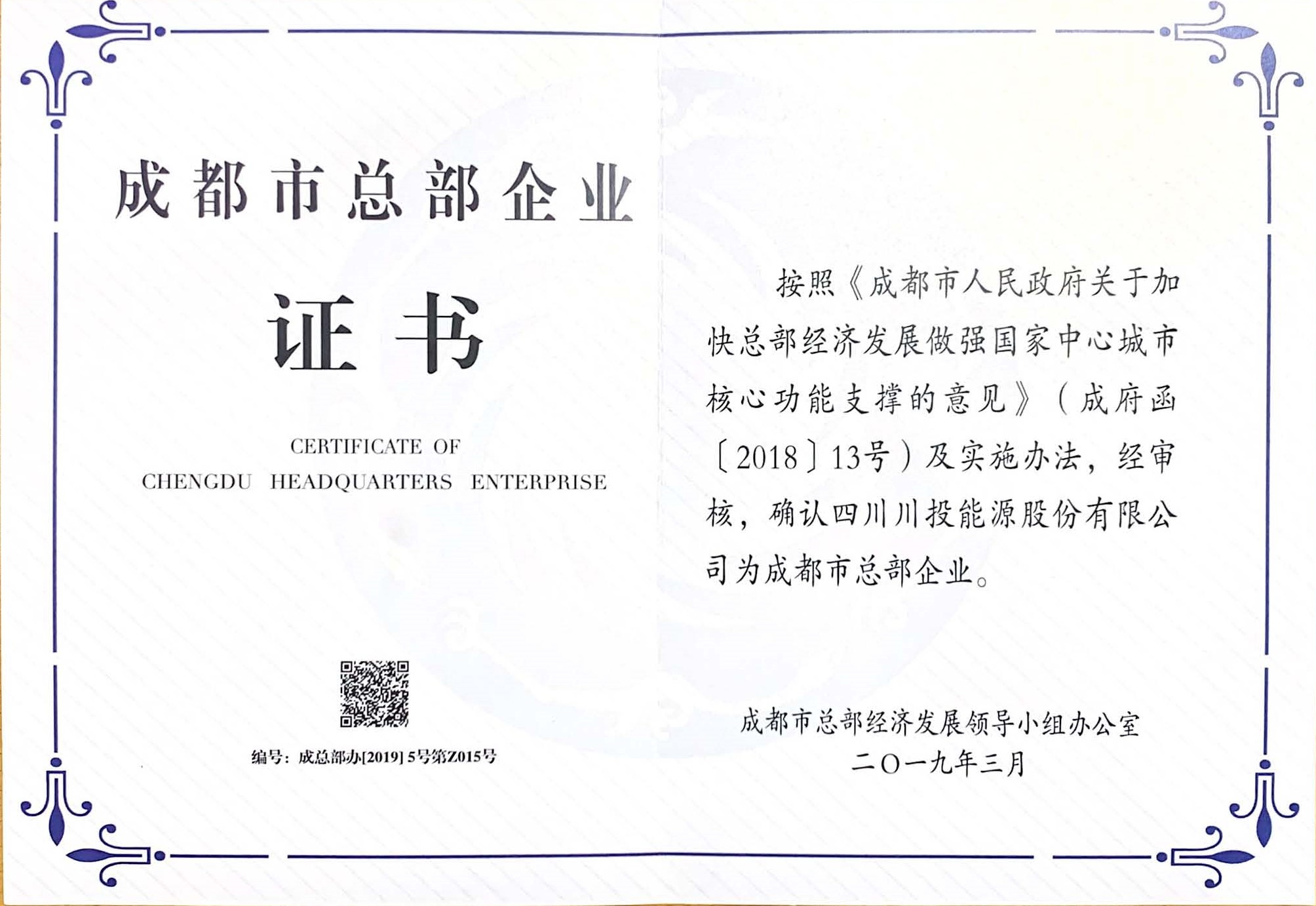 日前,從成都市總部經(jīng)濟(jì)發(fā)展領(lǐng)導(dǎo)小組辦公室處傳來喜訊,經(jīng)審核確認(rèn),川投能源正式通過2018年成都市第二批總部企業(yè)資質(zhì)認(rèn)證授牌,獲頒“成都市總部企業(yè)證書”,為2019年經(jīng)營管理工作再添亮點。