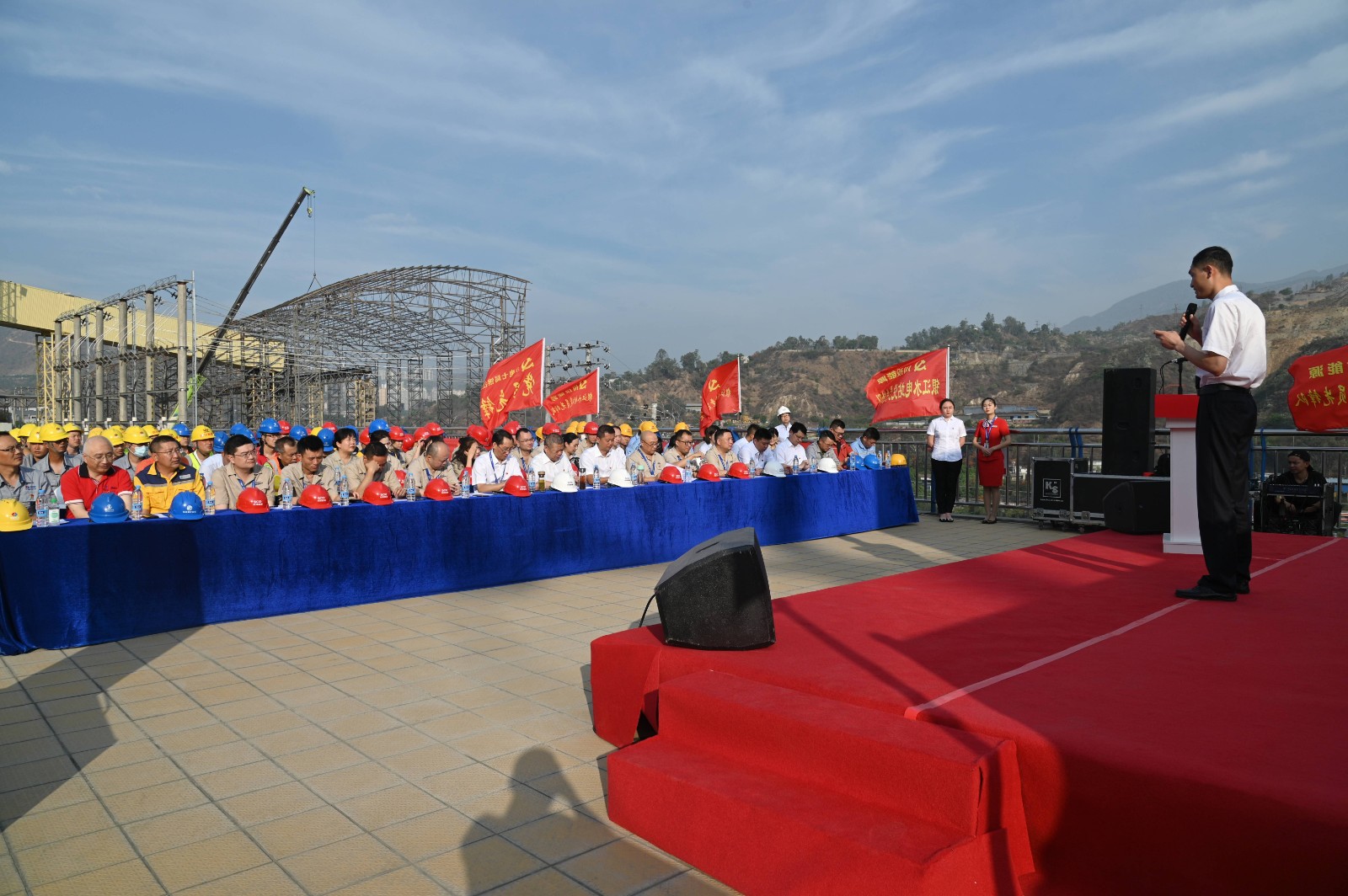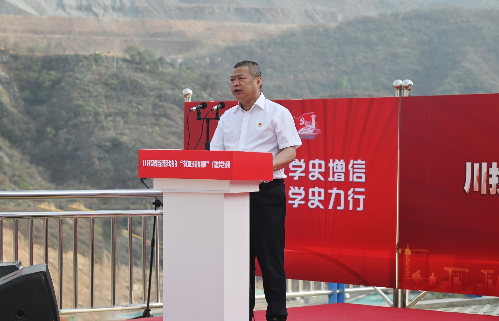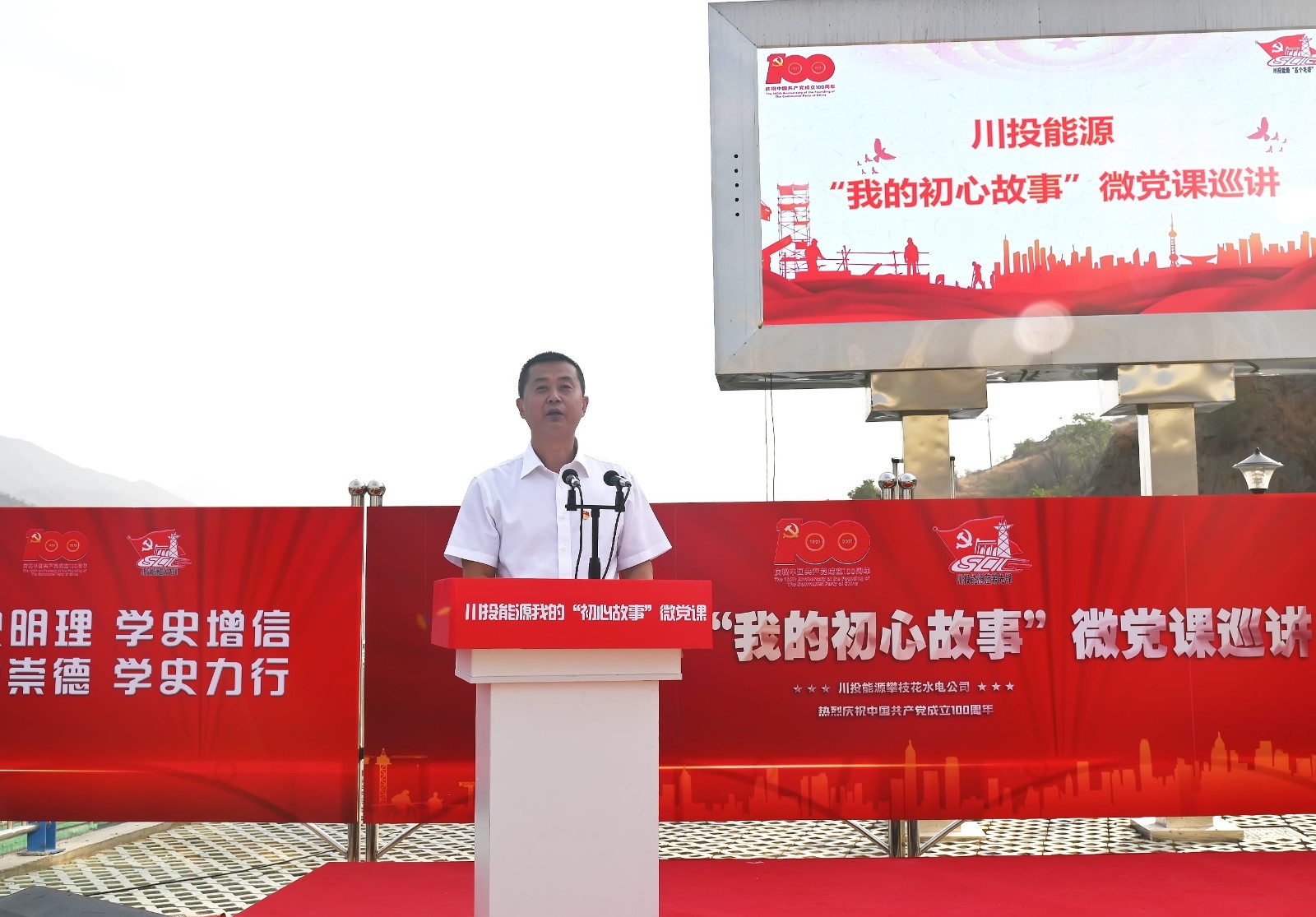 5月19日上午,川投能源“我的初心故事”微黨課巡講團(tuán)首站來到銀江水電站工地現(xiàn)場(chǎng),為攀水電及各參建單位黨員代表100余人帶來了一場(chǎng)紅色勵(lì)志的“視聽盛宴”。公司黨委書記、副董事長(zhǎng)、總經(jīng)理?xiàng)詈?,黨委副書記、工會(huì)主席楊超龍,副總經(jīng)理、攀水電公司黨總支書記、董事長(zhǎng)徐孝剛及各參建單位負(fù)責(zé)人參加現(xiàn)場(chǎng)巡講。
