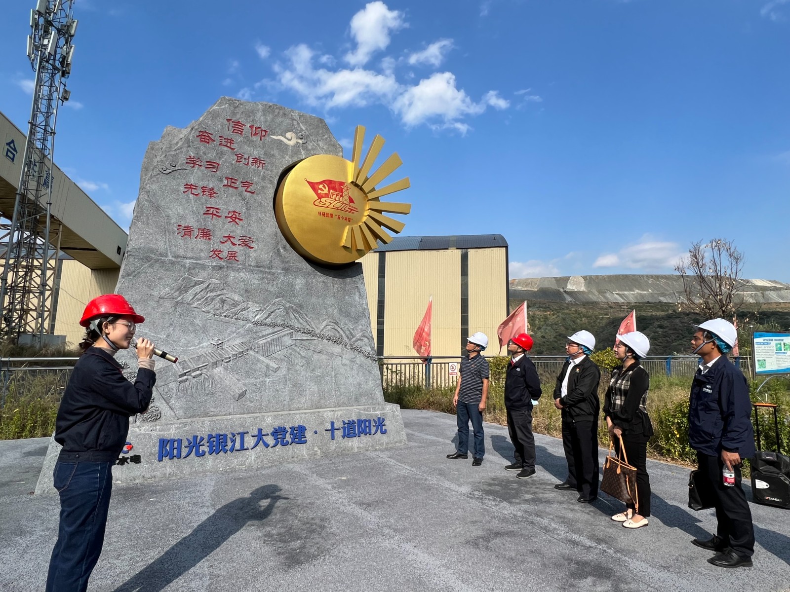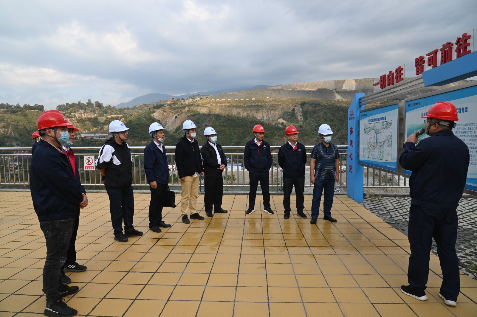 覃鳳荏一行首先來到銀江水電站施工現(xiàn)場,參加了銀江水電站大壩首倉混凝土澆筑活動。在現(xiàn)場聽取了銀江水電站工程整體規(guī)劃、建設(shè)意義、工期計劃等基本情況介紹,并參觀了鋼筋加工車間、試驗室等地。隨后,覃鳳荏一行參觀了攀水電公司“七色陽光大黨建”宣傳陣地,詳細(xì)了解了“十道陽光行動計劃”等內(nèi)容。