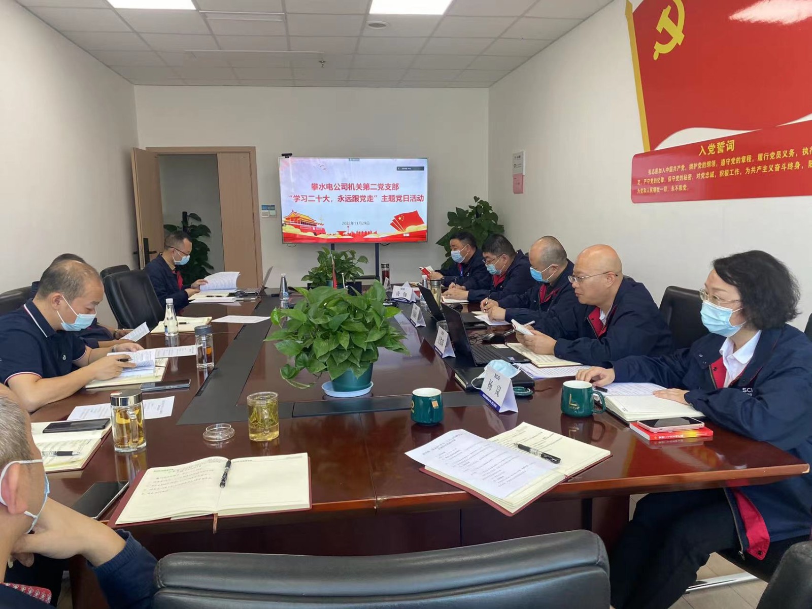 旗幟指引方向,信心凝聚力量。11月29日,攀水電公司機(jī)關(guān)第二黨支部采取線上與線下相結(jié)合的方式組織開(kāi)展“學(xué)習(xí)二十大,永遠(yuǎn)跟黨走”主題黨日活動(dòng),所屬黨員、非黨中干及入黨積極分子20人參加活動(dòng),黨總支副書(shū)記、總經(jīng)理吳巍嶼等5名領(lǐng)導(dǎo)班子成員、黨總支委員落實(shí)“雙重組織生活”要求,以普通黨員身份參加活動(dòng)。