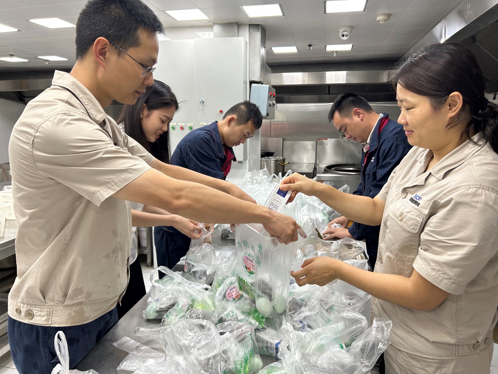 支部黨員、志愿者們放棄了難得的節(jié)日假期,下午就在職工食堂忙碌了起來(lái),鹵雞腿,蒸粽子,煮鹽蛋,采用流水線工作方式,把熱乎乎的雞腿、粽子、鹽蛋、牛奶等提前進(jìn)行分裝,方便工友們?cè)诠さ厥秤谩?