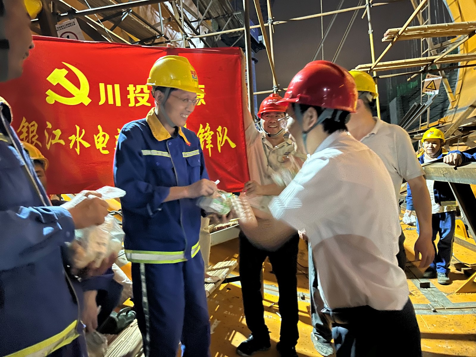 節(jié)日的銀江水電站施工現(xiàn)場(chǎng),大壩混凝土澆筑、廠房尾水管機(jī)電安裝、混凝土拌和系統(tǒng)等各部位一片忙碌,為按期實(shí)現(xiàn)各項(xiàng)節(jié)點(diǎn)目標(biāo),800余名建設(shè)者依然奮戰(zhàn)在銀江水電站施工現(xiàn)場(chǎng)。夜晚的工地更是燈火通明,晚上九點(diǎn),川投能源副總經(jīng)理,公司黨總支書記、董事長(zhǎng)徐孝剛帶領(lǐng)公司黨員先鋒隊(duì)、志愿者服務(wù)隊(duì),深入混凝土澆筑倉(cāng)面、尾水管、拌合樓調(diào)度室、防汛值班室、變電站、保安亭等部位,將熱乎乎的雞腿、香噴噴的粽子等慰問(wèn)品送到正在施工的每位工友手上。徐孝剛講到:“端午節(jié)是中華民族重要的傳統(tǒng)節(jié)日,對(duì)大家堅(jiān)持奮戰(zhàn)在銀江水電站施工現(xiàn)場(chǎng)斗酷暑、戰(zhàn)高溫、挑燈夜戰(zhàn)表示感謝,祝福大家端午安康!”活動(dòng)中,徐孝剛還開展了夜間安全檢查,叮囑大家做好防護(hù)、確保施工安全。
