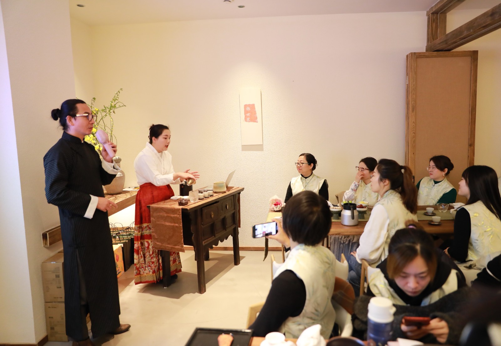 活動(dòng)現(xiàn)場,茶藝?yán)蠋煆牟枞~的起源、分類、功效、作用和泡茶知識技巧等方面進(jìn)行講解,并演示了沖泡流程。隨后進(jìn)行了實(shí)操比賽,大家紛紛動(dòng)手練習(xí)沖泡技巧,備器、煎水、賞茶、潔具、置茶、泡茶、奉茶、飲茶……,整個(gè)課堂充滿了幽幽茶香,大家在輕松愉悅的氛圍中,學(xué)習(xí)傳統(tǒng)茶藝禮儀。