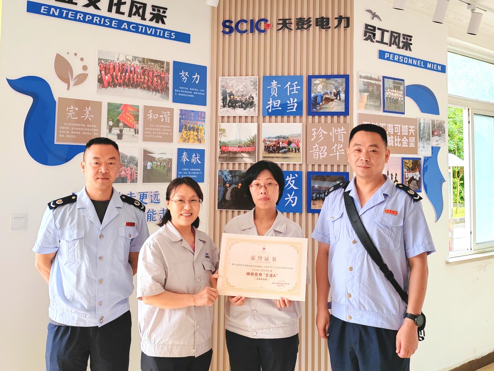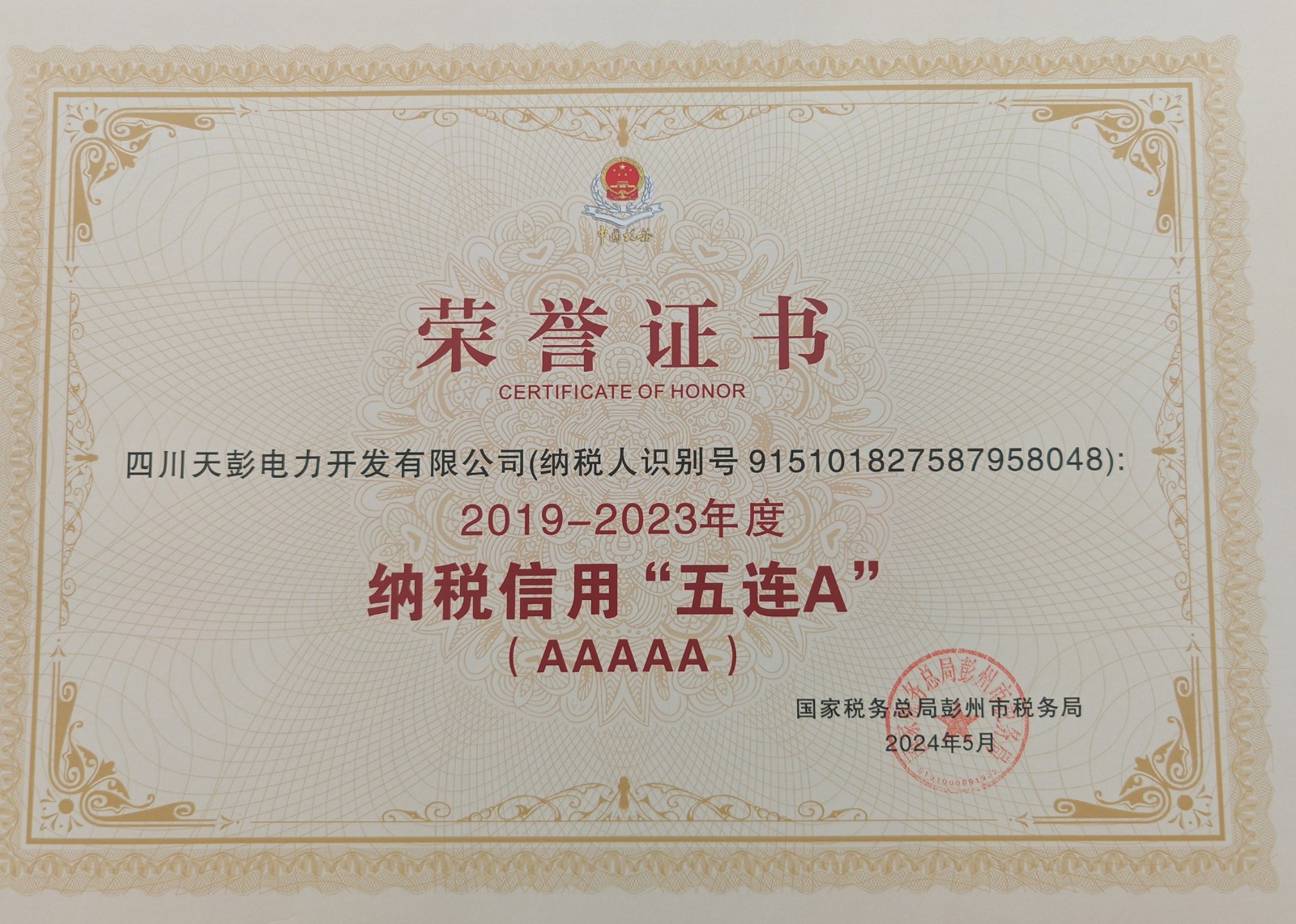 6月11日,天彭電力喜獲殊榮:國(guó)家稅務(wù)總局彭州市稅務(wù)局向我公司授予了“彭州市‘2019-2023年度納稅信用五連A’”榮譽(yù)證書(shū),這是稅務(wù)機(jī)關(guān)對(duì)我公司誠(chéng)信納稅、守法經(jīng)營(yíng)的肯定和表彰。