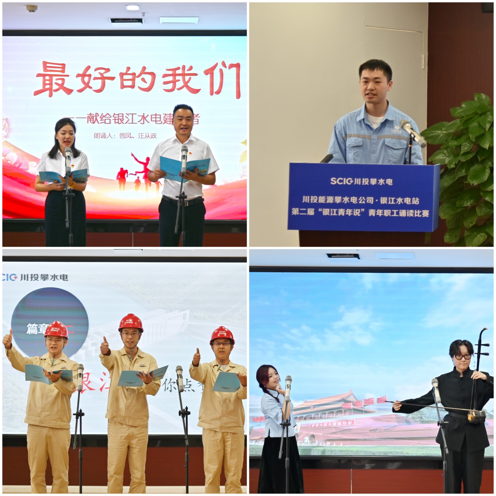 本次比賽以“蓄水發(fā)電加油干,銀江青年顯擔(dān)當(dāng)”為主題,來自公司及參建單位的10組14名選手結(jié)合各自的工作崗位精心創(chuàng)作了誦讀作品,他們中有剛退伍的發(fā)電部新兵,有剛畢業(yè)的財務(wù)新手,還有久經(jīng)沙場的一線職工,不同崗位、各色服飾、創(chuàng)意滿滿、精彩紛呈。來自水電五局項目部的黃山珊、扈文博身穿中國風(fēng)服裝,手拿傳統(tǒng)樂器二胡,以優(yōu)美的舞姿和深情的誦讀,回顧了歷史長河的中熱血青年,贊美了日夜奮戰(zhàn)在施工一線的銀江青年,充分展現(xiàn)了當(dāng)代青年的文化自信,勇奪比賽第一名;平日里不善言辭、埋頭苦干的工程小伙也勇敢站上講臺,致敬了他們心中“年輕的戰(zhàn)場”,以一段充滿激情的歌聲瞬間把現(xiàn)場氣氛點燃;還有發(fā)電部新入職的小姑娘,外表文靜的她卻有著極強的爆發(fā)力,讓大家刮目相看。