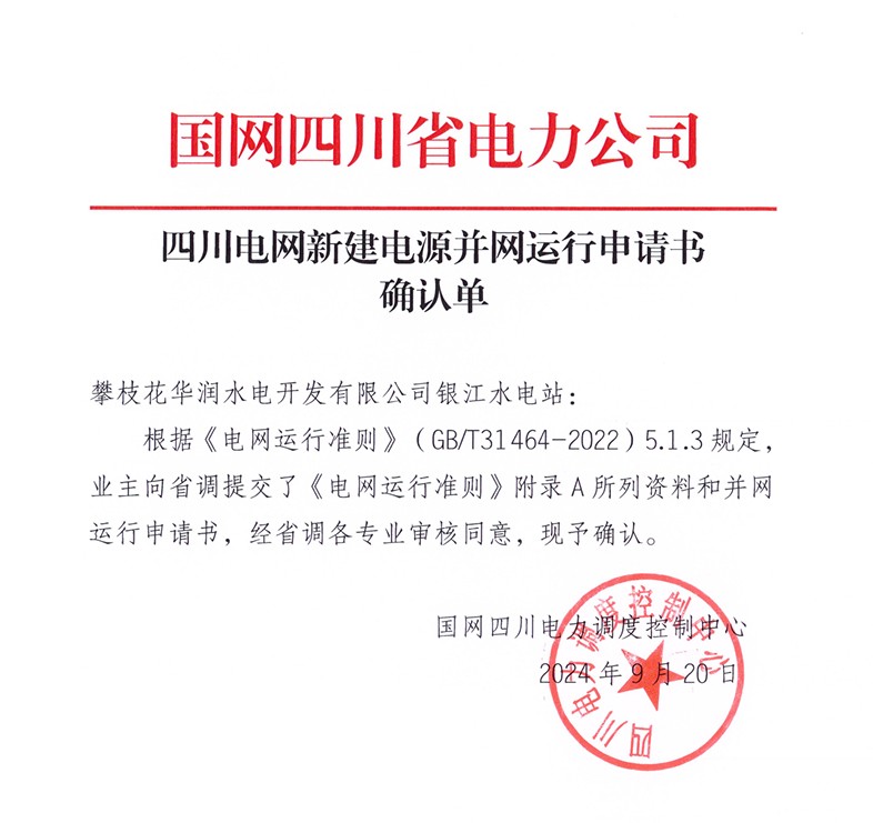 9月20日,在國(guó)網(wǎng)四川省電力公司和川投能源的指導(dǎo)幫助下,經(jīng)過(guò)積極對(duì)接、多方協(xié)調(diào),攀水電公司成功取得銀江水電站新建電源并網(wǎng)運(yùn)行申請(qǐng)書(shū)確認(rèn)單,標(biāo)志著銀江水電站具備并網(wǎng)手續(xù)辦理的資格條件。