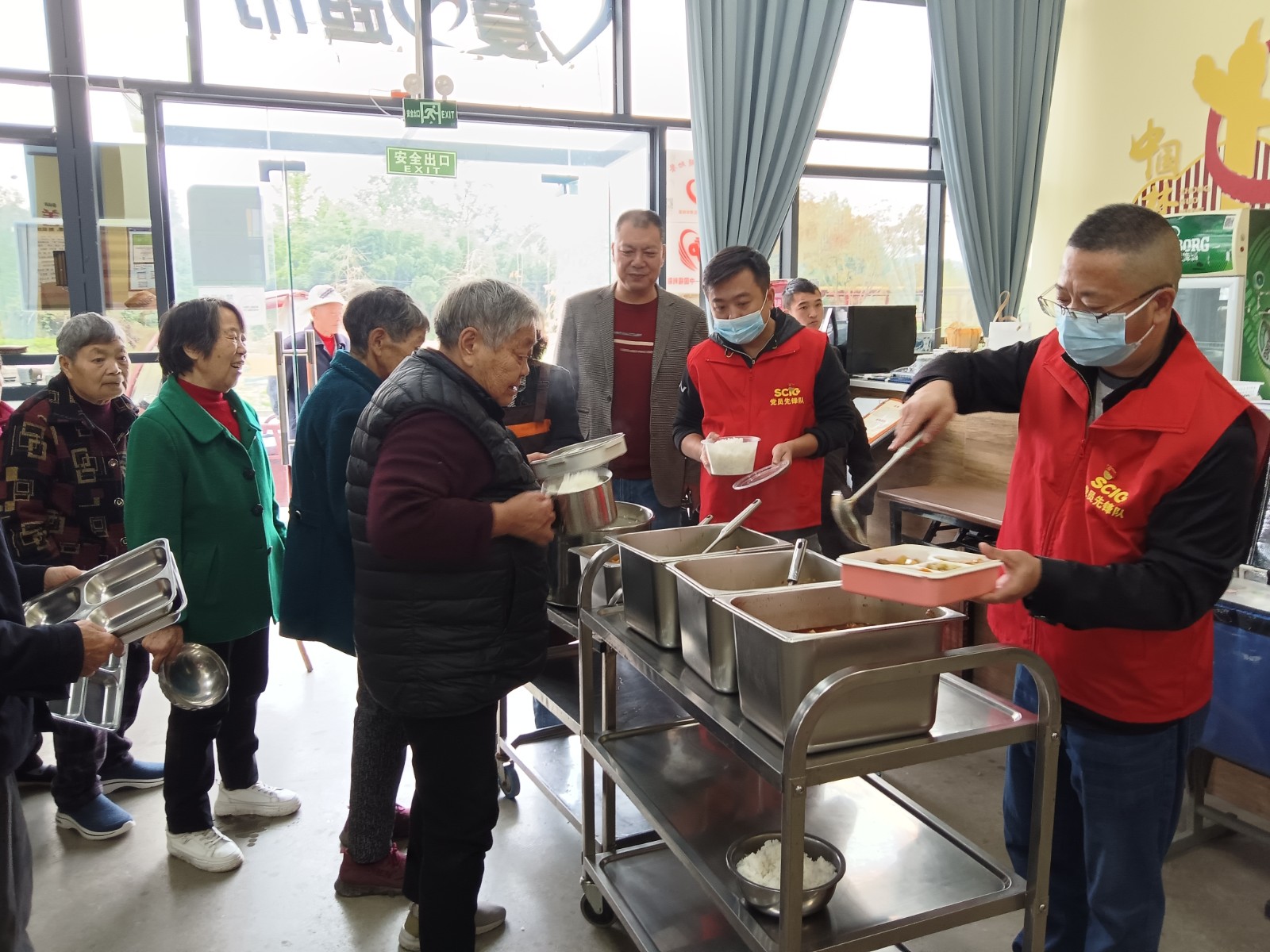 井然有序的活動現場,身著醒目紅色馬甲的黨員們迅速分工、密切合作,有的拿起掃帚、拖把和抹布開展衛(wèi)生清潔,從地面到墻面、從桌椅到餐具的每一個角落,為老人們營造整潔舒適的就餐環(huán)境;有的為行動不便的老年人及時送餐上門,讓他們能心情愉悅地享用美食;有的則陪伴在老人身邊與他們親切交談,關愛他們的健康與需求,傾聽他們的心聲與故事?!鞍謰屖程谩眱让β荡┧蟮狞h員身影,構成了一幅幅溫馨動人的畫面。