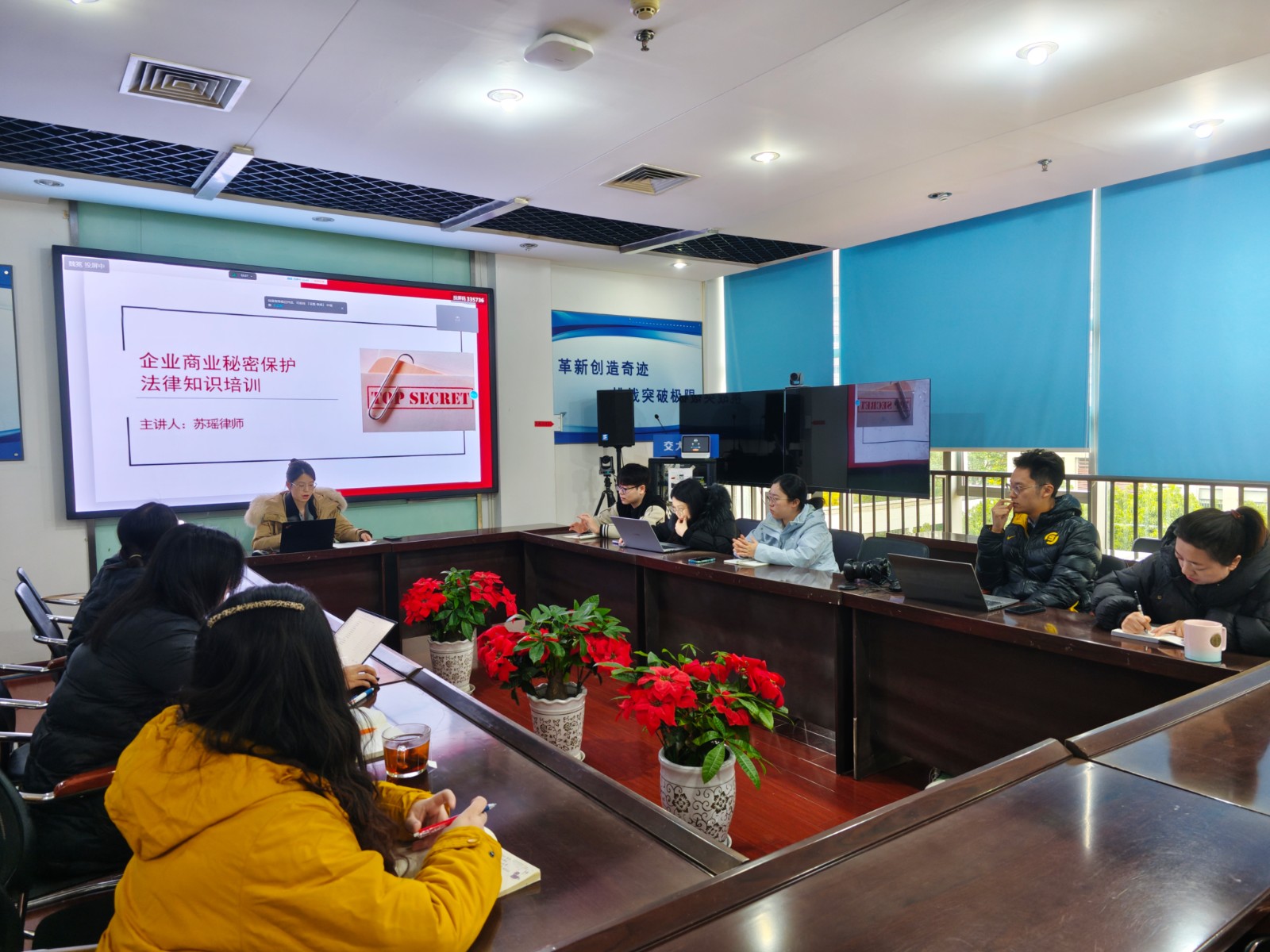 本次培訓(xùn)邀請公司常年法律顧問律師蘇瑤主講,她首先解讀憲法基本精神和特征,著重強調(diào)了民主、法治、人權(quán)三大核心價值,以及在推動國家治理體系和治理能力現(xiàn)代化方面的重要作用。在商業(yè)秘密保護方面,律師從定義、范圍、保護措施等入手,緊密結(jié)合企業(yè)管理實際特點,通過案例分析商業(yè)秘密泄露的常見途徑和后果,詳細介紹了如何建立完善商業(yè)秘密保護體系。在信息安全方面,律師結(jié)合《中華人民共和國網(wǎng)絡(luò)安全法》《中華人民共和國個人信息保護法》等法律法規(guī),從個人信息安全防護意識培養(yǎng)、辦公環(huán)境中信息安全實踐、網(wǎng)絡(luò)攻擊防范與應(yīng)急響應(yīng)策略、法律法規(guī)遵循與合規(guī)性要求進行解析,對如何提高公司信息安全能力提出專業(yè)意見。