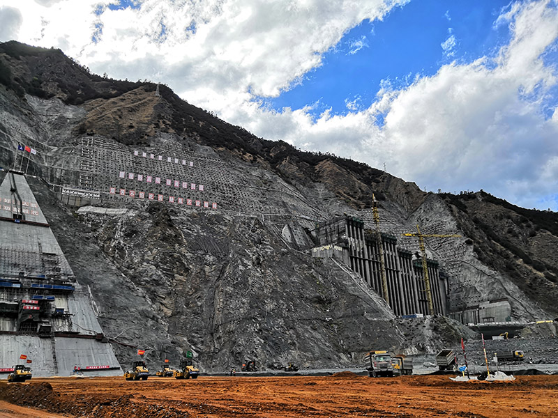 目前,正值兩河口電站工程建設的重要時期,到處都是熱火朝天的勞動畫面。上百家參建單位、2萬多名建設者揮灑“艱苦不怕吃苦、缺氧不缺精神”的豪邁情懷,克服“五高六大兩長”難點和高寒海拔惡劣自然環(huán)境、復雜的建設環(huán)境等不利條件,工程建設實現(xiàn)一個又一個里程碑目標。在高土石壩,上百臺推土機在工地上忙碌穿梭,建設者們忙碌的身影和機械的隆隆聲交織回蕩在高山峽谷中,這座世界第3高壩正日益成型;在兩岸巖壁上,為了在200層樓高的幾乎垂直的巖壁中固定15000根錨索,黨員帶頭沖鋒在前,硬是將一根根的錨索肩扛手提抬了上去;在地下廠房,建設者們克服潮濕昏暗、溫差變化大的不利條件,晝夜不停精心安裝碩大無比的發(fā)電裝置,工地上隨處可見一面面黨員突擊隊、青年突擊隊火紅的旗幟迎風飄揚,成為一道道亮麗的風景線。