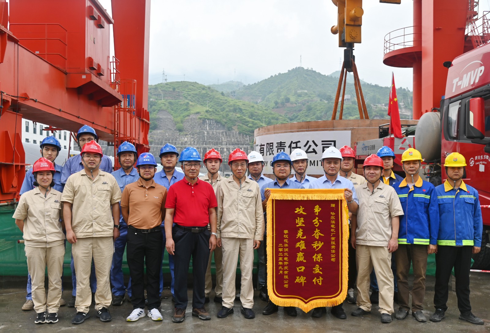 26日上午,現(xiàn)場(chǎng)各單位立即投入到吊裝前的準(zhǔn)備工作中。攀水電公司全程跟進(jìn)機(jī)電安裝進(jìn)展,逐一確認(rèn)安裝條件;施工單位技術(shù)人員按吊裝方案全面落實(shí)安全交底與技術(shù)措施,確保萬(wàn)無(wú)一失;在各項(xiàng)準(zhǔn)備工作全面就緒的基礎(chǔ)上,6號(hào)機(jī)組的轉(zhuǎn)子支架平穩(wěn)、精準(zhǔn)吊裝就位。川投能源副總經(jīng)理、攀水電公司黨總支書(shū)記、董事長(zhǎng)徐孝剛現(xiàn)場(chǎng)督導(dǎo)吊裝工作,充分肯定了哈電公司在本次極端條件下的運(yùn)輸成績(jī),并向哈爾濱電機(jī)廠有限責(zé)任公司授予錦旗,感謝其長(zhǎng)期以來(lái)對(duì)銀江水電站建設(shè)的大力支持。