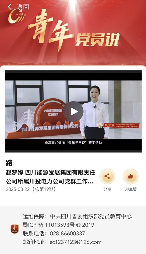 近期,四川省委組織部舉辦的“青年黨員說”研學活動正在四川黨建官網等平臺集中展播。省國資委黨委共推薦10名青年黨員代表圍繞“學習新思想,爭當改革先鋒”為主題,談體會、談感悟。其中,由四川能源發(fā)展集團上報、川投能源推薦的作品《路》,通過講述“兩路”精神的歷史內涵,結合川投電力腳基坪電廠震后緊急搶險、天彭電力鳳鳴湖水庫飲水廊道清淤、玉田電廠為涼山州彝族村民送水送電等鮮活事例,展現能源人在逆行搶險、為民服務和民族團結中的責任擔當,號召新時代國企人賡續(xù)“兩路”精神,汲取奮進力量,展現了能源國企的使命擔當。